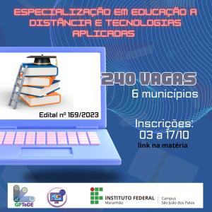 Foi lançado o Edital para seleção de candidatos ao Curso de Especialização em Educação à Distância e Tecnologias Aplicadas. As inscrições são gratuitas e podem ser feitas no período de 03 a 17 de outubro.