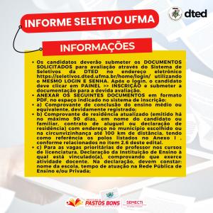 Os candidatos deverão submeter os DOCUMENTOS SOLICITADOS para avaliação através do Sistema de Seletivos da DTED no endereço eletrônico https://seletivos.dted.ufma.br/home/login/ utilizando o MESMO LOGIN E SENHA. Após o login, o candidato deve clicar em PAINEL >> INSCRIÇÃO e submeter a documentação para a devida avaliação.